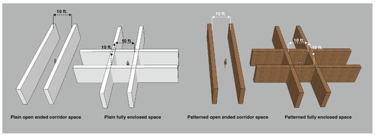 | In this set of models, there are four different spaces consisting of two open-ended corridors and two enclosed spaces. None of the spaces have roofs. |