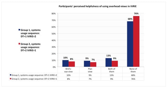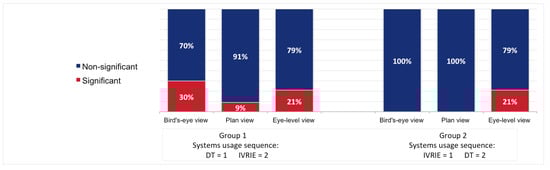 - With a system usage sequence of IVRIE to DT, the percentage of participants with a significant difference between their perceived and actual use of the eye-level views when designing in the DT system was 58% higher than among the participants with the opposite order of systems use.