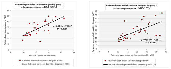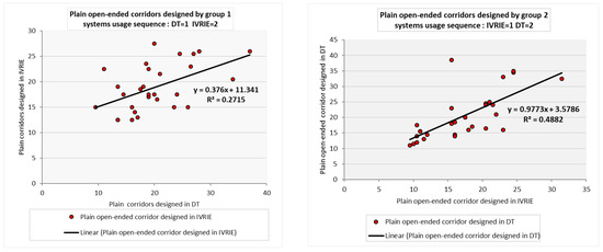 - There were strong linear regressions between the widths of open-ended corridors designed by participants when utilizing DT first and IVRIE second. In this sequence, the birds’-eye, plan, and eye-level views were utilized in the DT system and then the eye-level view was used in IVRIE.