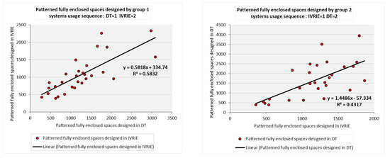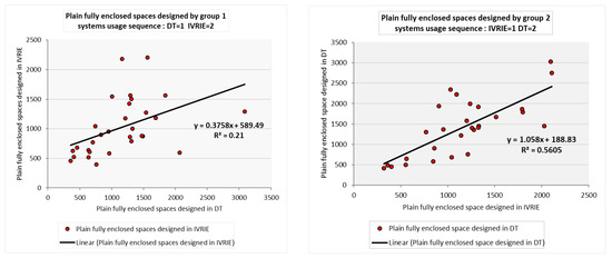 3.2.2. Linear Correlations among the Sizes of the Fully Enclosed Spaces Designed Utilizing Both Systems