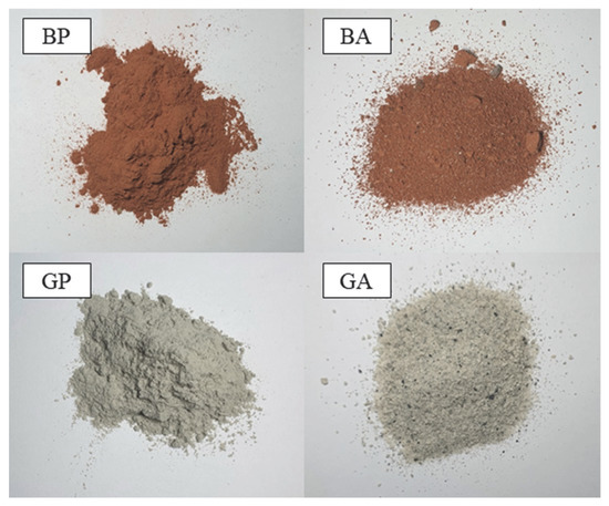 Two types of waste, clay brick and granite block, were obtained from a building demolition in Korea. These two wastes were washed with tap water to remove impurities, then dried and crushed in a ball mill [16]. Afterward, recycled brick (RB) and recycled granite (RG) with two different particle sizes, ranging from 150 μm to 2.36 mm and smaller than 150 μm, were collected, respectively. RG and RB with particle sizes from 150 μm to 2.36 mm were named recycled granite aggregate (GA) and recycled brick aggregate (BA) and were used as partial replacements for fine aggregates in mortar mixtures. RG and RB with particle sizes smaller than 150 μm were denominated as recycled granite powder (GP) and recycled brick powder (BP) and used as partial replacements for cement (Figure 1). The particle size distribution curves of the four prepared recycled materials are provided in Figure 2.