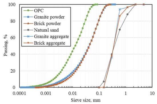 In order to reduce dependence on sand and cement, there have been studies using construction and demolition (C&D) waste as raw materials for concrete. It has often been reported that the main component of C&D waste is concrete, and accordingly, extensive research has been conducted on the recycling of concrete waste. Followed by concrete waste, several studies have shown that bricks are one of the largest types of C&D waste in various regions [4,5,6,7]. Ding and Xiao [8] reported that in 2012, bricks and blocks accounted for 38% of construction waste and 63% of demolition waste in Shanghai, China. Granite waste belongs to the category of waste due to its non-biodegradable nature, and it can also be generated by cutting and grinding stones, as well as by damage, demolition and aging of stone products. In particular, Singh et al. [9] stated that the amount of granite waste generated during the production stage is nearly 65% of the total granite production. Therefore, some studies have been conducted using brick waste and granite waste as replacements for cement and sand in cement composites.