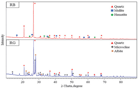 The physical characteristics of RB and RG are given in Table 2. The chemical and mineralogical composition was investigated using XRF and XRD techniques, and the results are shown in Table 3 and Figure 3. For RB, the percentage of SiO2 + Al2O3 + Fe2O3 is greater than 70%, complying with the chemical composition requirements of pozzolanic materials according to ASTM C618 [17], whereas GB does not. The main minerals constituting RB were quartz (SiO2), mullite (3Al2O3·2SiO2), and hematite (Fe₂O₃). For RG, the main minerals were quartz, microcline (KAlSi3O8) and albite (NaAlSi3O8).