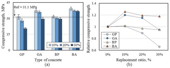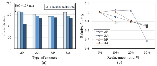 The flow table test results of mortars in which cement and sand were partially replaced by RG and RB are shown in Figure 4a. It is worth mentioning that the water-to-binder ratio was kept constant to evaluate only the influence of RG and RB in the mortar. As shown in Figure 4a, the increase in the replacement ratios of RG and RB (both powders and aggregates) decreased the fluidity of the mortar. The flow of the reference mortar, which does not contain any recycled materials, was 159 mm, and the GP10, GP20 and BA10 achieved a similar flow to that of the reference mortar. The flow of mortars, except for these three series, was in the range of 68–95% of that of the reference mortar. It has been reported that this decrease is associated with the irregular surface texture and angular shape of RG and RB and the high water absorption of RB [23,24,25]. Nevertheless, there was no significant difference between the flow values of GA-based mortars and BA-based mortars. Although mortars with BA would be expected to have a poorer consistency due to its greater absorption, the rough and irregular surface of GA due to the crushing process is likely to have a comparable effect on consistency.