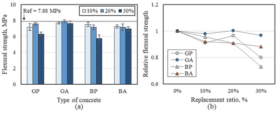 As shown in Figure 6b, when RG was used as a substitute for sand, higher flexural strength was achieved than when RG was used as a cement replacement. On the contrary, recycling RB as powder rather than aggregate at 10% and 20% replacement ratios was more favorable for the development of flexural strength.