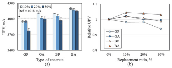 At the given replacement ratios, the UPV of the GP- and BP-based mortar ranged from 93.9–98.3% and 98.8-102.1% of the reference concrete, respectively. As shown in Figure 7b, the UPV values tend to be higher in the mortars containing recycled aggregate (i.e., GA and BA series) than in the mortars containing recycled powder (i.e., GP and BP series). The UPV results are in good agreement with the trend observed in the compressive strength tests of the corresponding mortars.