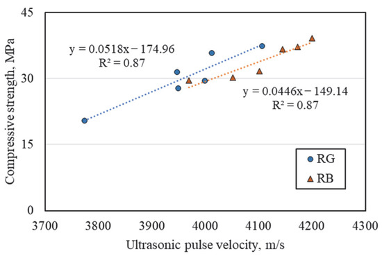 Figure 8 shows the correlation between compressive strength and UPV for the mortars prepared in this study. A linear relationship between the two parameters was observed, and the R2 coefficient of determination was 0.87, indicating that there is very high reliability in predicting the dependent variable. Thus, the UPV technique can be useful for estimating the compressive strength of cement composites containing RG and RB as sand and cement replacements.