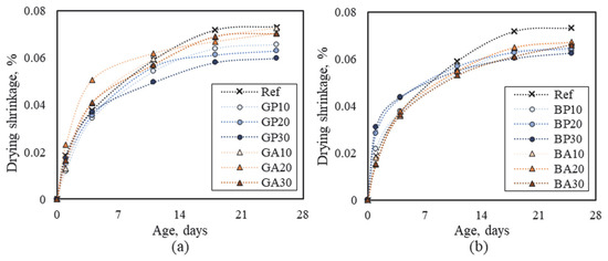 Since GA and BA used in this study are finer than sand, drying shrinkage may have been reduced due to improved pore structure and reduced evaporation of water through capillary pores. These results have been frequently reported in studies using RB and RG as partial substitutes for fine aggregates [41,42,43].