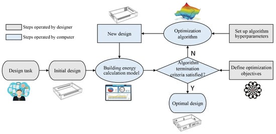 Several energy-efficient building technologies have been proposed to improve building energy efficiency, among which the building energy optimization (BEO) technique has emerged as a promising method to achieve high-performance design, with particular emphasis on building energy. It has been revealed that it can reduce building energy use by up to 30 percent compared to a benchmark design []. The general procedure of the BEO technique is illustrated in Figure 1. As shown, it relies on optimization algorithms to create new designs according to preset design objectives and simulation results. This technique has been widely applied in optimizing building systems (such as lighting and HVAC), building envelopes (such as form, construction, and double-skin facades) and renewable energy generation (such as solar and ground energy) [].