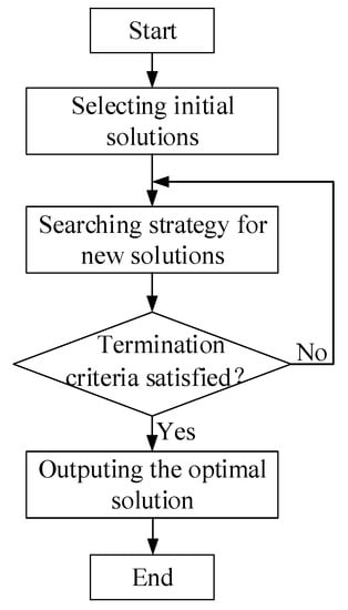 As illustrated in Figure 1, the optimization algorithm plays a vital role in the BEO workflow. The algorithm drives the whole technical process, automatically adjusts the design variables to generate new designs, and regularly finds an optimal design that meets the predefined objective. Therefore, the efficacy of an algorithm significantly affects the efficiency of the BEO technique. Currently, there are a variety of optimization tools can be integrated into the BEO technique [], including GenOpt, modeFRONTIER, ModelCetner, Matlab, jEPlusþEA, MOBO, ENEROPT, GENE_ARCH, and Grasshopper plugins, such as Galapagos, Goat, Silvereye, Opossum, Optimus, RBFMopt, and Dodo. Among them, MATLAB is one of the most often used [] and was adopted in this study. These optimization tools are often embedded with various optimization algorithms which generally fall into three categories: direct search, intelligent optimization, and hybrid. Our previous review found that [] intelligent algorithms are the most popular in BEO, followed by direct search algorithms. Among intelligent algorithms, the genetic algorithm (GA) and its modified versions are dominant, followed by the particle swarm optimization (PSO) algorithm. Although many algorithms are currently used, not all algorithms work well for any given BEO problem. Figure 2 illustrates the general working mechanism of optimization algorithms. Starting from one or several initial solutions, a certain strategy is applied to guide the next search for new solutions, the search is stopped when the termination conditions are met, and finally, the optimal solution examined in the run is output. Therefore, the selection of the initial solutions, the strategy of searching for new solutions, and the hyperparameters of the algorithm that implement the searching strategy determine the search path, and thus determine the algorithm’s global search ability and the overall running time.