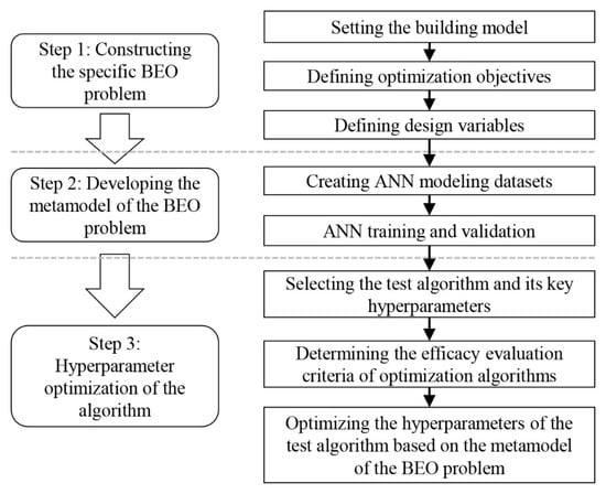 The workflow of the proposed methodology is summarized in Figure 3. As shown, it mainly includes three steps: constructing the specific BEO problem, developing the metamodel of the problem, and hyperparameter optimization of the algorithm applied in BEO. Detailed explanations of each step are given below.
