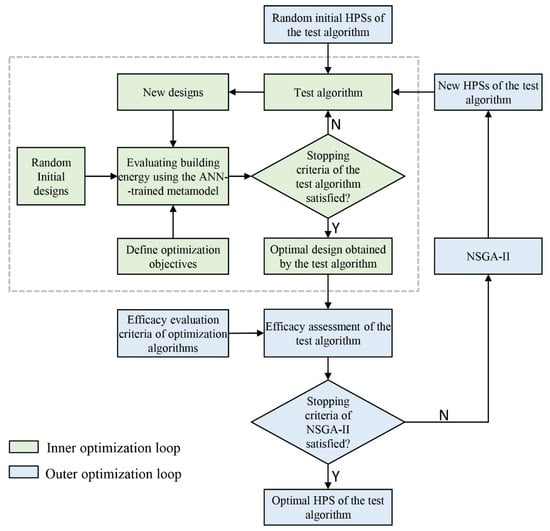 Figure 4 illustrates the flowchart of Step 3, which essentially involves two optimization loops. The inner loop is driven by a test algorithm that requires hyperparameter optimization. It solves the specific BEO problem modeled by the ANN. The outer optimization loop is driven by NSGA-II, which automatically tunes the HPSs of the test algorithm. For each adjustment, the inner loop is run accordingly, and the efficacy of the test algorithm is assessed. The outer loop ends when reaching the termination condition of NSGA-II, and the optimal HPS of the test algorithm over the whole computing run is output. The optimization objectives of the outer loop are the efficacy criteria of optimization algorithms proposed in our previous works [,], which aim to quantitatively describe the different performance aspects of algorithms applied in BEO. Specifically, the performance criteria for single-objective test algorithms include (1) the quality of the optimal design obtained, (2) the computing time, and (3) the diversity of all designs searched in an optimization run. The performance criteria for multi-objective test algorithms include (1) the number of Pareto solutions, (2) the quality of the Pareto solutions, (3) the diversity of the Pareto solutions, and (4) the computing time. In practice, users are recommended to select the criteria they care most about. Furthermore, the reasons for choosing NSGA-II as the optimizer of the outer loop are manifold. NSGA-II is one of the most commonly used algorithms in engineering optimization. Its robustness to HPSs has been verified as good in some previous works [,]. Moreover, appropriate HPSs for NSGA-II have been suggested in some previous works and have been successfully applied in some implementations. Andersson et al. [] suggested the HPS for NSGA-II as a crossover rate of 0.9, a mutation rate of 0.008, and a population size of 100.