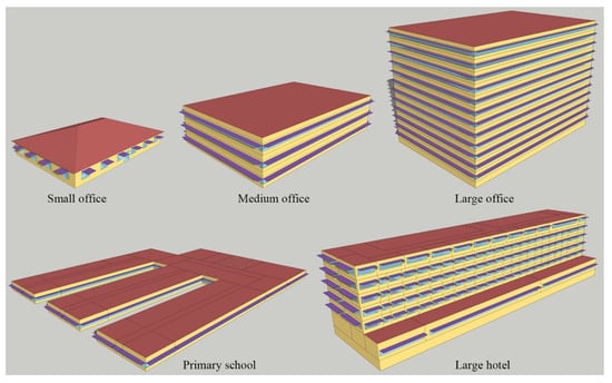 To investigate the applicability and reliability of the proposed methodology, a set of BEO problems with different properties was constructed based on the DOE benchmark commercial buildings []. Five new-construction building types, namely, small office, medium office, large office, primary school, and large hotel, were modified. Specifically, overhangs were added to the original DOE models to investigate their impact on building energy and thermal comfort. All these buildings were located in Baltimore, Maryland, in the 4A climate zone according to the US standard. Figure 5 shows the architectural schematic views of the five building models and Table 1 summarizes their characteristics.