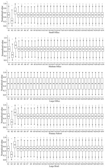 EnergyPlus was integrated with modeFRONTIER to automatically simulate the AEC and AAPPD of the samples. McKay [] and Asadi et al. [] found that it was sufficient to correctly characterize the search space when the number of cases sampled using LHS exceeded twice the number of design parameters. Therefore, the number of samples gathered for each BEO problem is equal to 50 times the number of inputs times the number of outputs. For example, for a bio-objective optimization problem with 30 design variables, 3000 design samples were generated. The time consumed for objective simulation of design samples is summarized in Table 3. Finally, the input (sample designs) and output (corresponding AEC and AAPPD) data were imported into the neural network toolbox of MATLAB to train and validate ANN models. The normalized sample distribution of benchmark problems with 30 design variables is illustrated in Figure 6. As shown, the value range of each variable is uniformly covered.