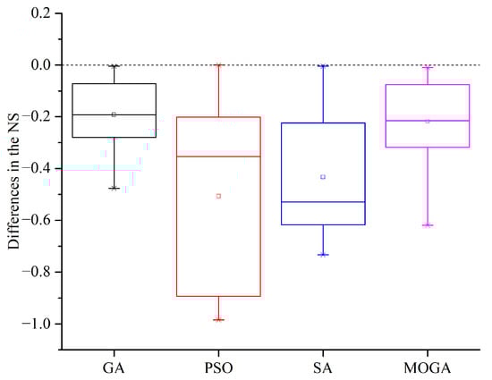 Illustration of the differences in the NS when the test algorithms use the optimal HPSs and the default ones.