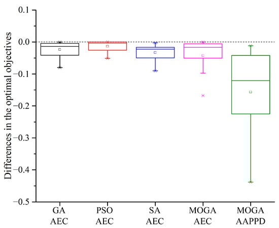 Regarding the quality of the optimums obtained by the test algorithms when solving the 15 benchmark problems, compared with the default HPSs, the AEC variation range of the GA, PSO, SA, and the MOGA when using the optimal HPSs is −7.99–−0.04%, −5.13–0%, −9.04–−0.28%, and −16.76–0%, respectively. The AAPPD variation range of MOGA is −43.84–−0.02%. As illustrated in Figure 10, the MOGA generally benefited the most from hyperparameter optimization with the highest reductions of AEC and AAPPD. Among the three single-objective algorithms, hyperparameter optimization is shown most favorable to SA, followed by the GA. By contrast, PSO had the smallest improvement in the quality of the optimum, which demonstrated an insensitivity to hyperparameters; therefore, hyperparameter optimization is mainly beneficial to the running time of PSO.