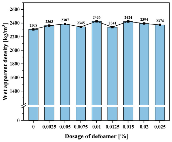 The influence of defoamer on the wet apparent density of grouts is shown in Figure 2. Comparing the grouts with and without defoamer, the wet apparent density of the grouts with defoamer was increased by 1.43~5.11%. When the dosage of defoamer was 0.01%, the wet apparent density of the grouts was at its highest. After adding defoamer, the wet apparent density of the grouts increased, which further confirms the inhibition and elimination effect of defoamer on foams.