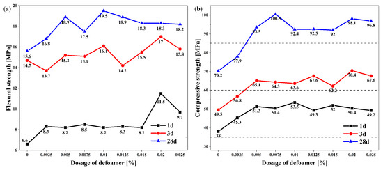 Influence of defoamer on the mechanical properties of grouts: (a) flexural strength; (b) compressive strength.