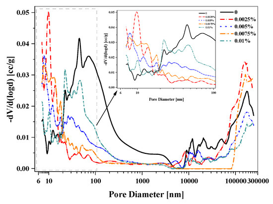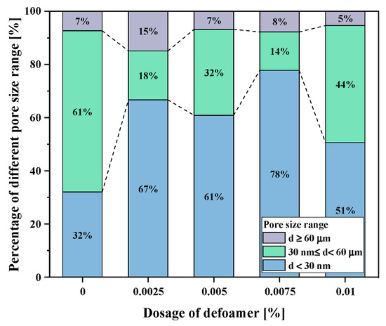 Defoamer optimizes the pore structure of hardened grout through its defoaming effect as shown in Figure 5. The pore volume of the grout mixed with defoamer is less than that of the grout without defoamer in the range of 30 nm to 60 μm, and the pore volume of the grout below 30 nm increases. Most importantly, the pore structure determines the mechanical strength of the grout [28,29]. Figure 3b and Figure 6 show the influence of defoamer on the pore structure and compressive strength at 28 d, indicating that the lower the porosity, the greater the compressive strength. However, when the defoamer is overmixed, it has a negative effect on the strength of mortar.