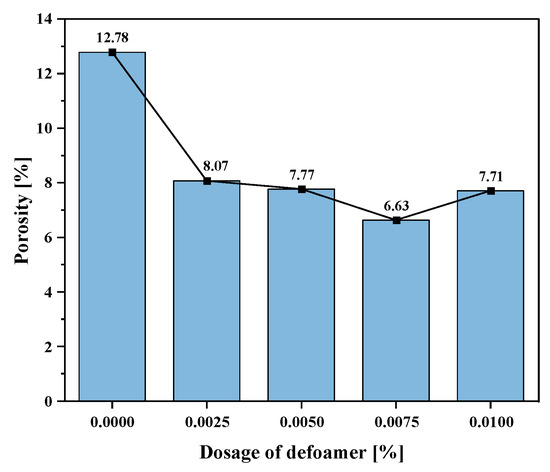 Following the MIP tests, Figure 4 presents the pore size distribution in the range of 6 nm to 300 μm for the grout specimens without defoamer and with defoamer admixtures of 0.0025%, 0.005%, 0.0075% and 0.01%. In the pore size range from 6 nm to 30 nm, the pore volume of the grout with defoamer was generally larger than that of the grout without defoamer. When the dosage of defoamer was 0.0025%, the pore volume was highest, and a very high peak appeared at 10 nm. When the dosage of defoamer was 0.01%, the pore volume was lowest and close to that of the grout without defoamer. In the wide pore size range from 30 nm to 60 μm, the pore volume of the grout without defoamer was almost always the highest of all the grouts, and there were five peaks: two larger peaks at 45 nm and 70 nm and three smaller peaks at 12 μm, 20 μm and 51 μm. The pore volumes of the other four types of grout mixed with defoamer were smaller than those of the grout without defoamer, and the corresponding pore volume peaks were reduced or disappeared completely. It follows that pores in the range from 30 nm to 60 μm can be considered harmful pores, which could reduce the compressive strength of the grout. When the dosage of defoamer was 0.01%, the pore volume was only inferior to that of the grout without defoamer. When the dosage of defoamer was 0.0025% and 0.0075%, the pore volume was relatively small. In the pore size range from 60 μm to 300 μm, all five grouts showed a peak close to 170 μm with the highest pore volume observed when the dosage of defoamer was 0.0025% followed by the grouts with 0.0075%, 0, 0.005% and 0.01% defoamer, in that order. In order to further analyze the influence of defoamer on pore structure, the variation in the regulation of defoamer on different pore size range percentages and the porosity of the grouts is illustrated in Figure 5. The maximum proportion of the pore size range of 30 nm to 60 μm in the grout without defoamer was 61%, whereas a pore structure of 30 nm to 60 μm in the grouts with added defoamer was gradually transformed to a pore structure of less than 30 nm. In particular, when the dosage of defoamer was 0.0075%, the maximum amount of grout with a pore size below 30 nm was 78%, which was more than twice that of the grout without defoamer. However, when the dosage of defoamer increased from 0.0075% to 0.01%, the pore volume below 30 nm decreased to 51%, which was smaller than that of all the grouts mixed with defoamer. The influence of defoamer on the porosity of the grouts is shown in Figure 6. It can be seen that as the defoamer content increases from 0 to 0.01%, the porosity of the grout first decreases and then increases slightly. When the dosage of defoamer increases from 0 to 0.025%, the porosity of the grout decreases by 36.6%, indicating that a low amount of defoamer can significantly reduce the porosity of grouts. As the dosage of defoamer continues to increase, the porosity of the grout slowly decreases. When the dosage of defoamer is at 0.0075%, the porosity is at its lowest. However, when the dosage of defoamer increases from 0.0075% to 0.01%, the porosity of the grout increases by 16.3%. Macropores (>30 nm) in the hardened grouts are more likely to produce weak spots for cracking under loading, which explains the decrease in compressive strength at 28 d and the increase in porosity when the dosage of defoamer is 0.001%. Therefore, in combination with Figure 5, it can be seen that 0.0075% is the optimal dosage with regard to the pore structure of grouts.