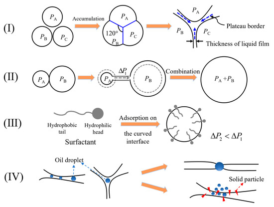 where ΔP is the additional pressure under the curved interface, γ is the surface tension of the liquid phase and R is the radius of curvature of the foam. Because the radius of curvature of the PA and PB foams is different, there is additional pressure under the curved interface, and PA > PB; therefore, the air in the smaller foam runs into the larger foam. However, in fresh grout, the surfactant is attached to the foam surface and exists in the plateau border; this reduces the surface tension in the gas–liquid phase and thus reduces the additional pressure, which extends the life of the foam, i.e., its stability is enhanced as shown in Figure 7, III. In this study, the defoamer used was an oil–solid agent, and there are two main antifoam mechanisms: the antifoam action of oil droplets and the pin effect of solid particles as shown in Figure 7, IV [19,27]. In the grout mixed with defoamer, the oil droplets will connect the two sides of the foam film, that is, form a bridge between them. Subsequently, the equilibrium at the gas–liquid interface is broken by the penetration of the oil droplets, and the foam film is disrupted by the requirements of the laws of capillarity. In addition, the solid particles reduce the barrier for oil droplets to enter the foam film and puncture into the foam film through the pin effect, which destabilizes the three gas–water–oil phases and promotes the movement of the oil droplets.