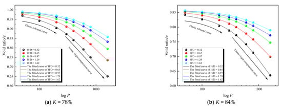 Figure 6 displays the compression curves for various H/D ratios under different compaction degrees. The fitting results are shown as solid lines in the figures. As expected, the compression curves with the higher H/D ratios were always on top of those with the lower ones. It was discovered that the Gompertz equation could accurately describe the compression curve (all R2 values are over 0.9), indicating that the development of compressive deformation of remolded loess is not affected by the H/D ratio. The identification of the transition between the elastic rebound curve and the virgin compression curve at the same compaction degree became more challenging as the H/D ratio rose. This can be attributed to the friction applied on the samples increasing with the increase in the H/D ratio. The strain of the sample decreases at the same pressure, and the compression curve is flatter, so the transition point was not easily identified. In contrast, the identification of transition becomes easier with an increase in the compaction degree for the same H/D ratio. This can be interpreted as the soil structure becoming more compact with the increase in compaction degree from 78% to 95%. The slope of the elastic rebound curve with an H/D ratio of 0.32 was reduced by 68.97%, while it was reduced by 63.48% for an H/D ratio of 1.62. The elastic rebound curve became flatter due to fewer pores to compress. As a result, the transition point was simpler to locate.