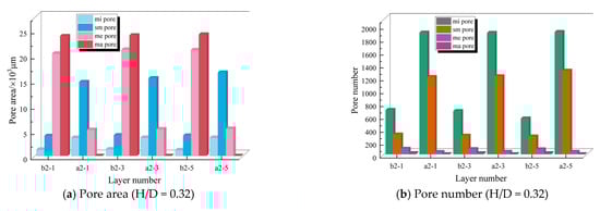The distribution of pores is a direct reflection of variation in soil structure. The pores in loess can be classified into four types based on their mean radius [32]: micropores (<1 μm), small pores (1–4 μm), mesopores (4–32 μm), and macropores (>32 μm). Figure 9 illustrates the distribution of pores in different layers with the H/D ratio of 0.32 and 1.62 at a compaction degree of 78%. The distribution of the same type of pores varied little across all layers before compression, with the largest differences in the area of macropores, mesopores, small pores, and micropores of 1.38%, 4.36%, 5.42%, and 11.81%, respectively, and the largest differences in pore numbers of 11.11%, 10.61%, 10.11%, and 19.31%, respectively. This suggests that the remolded loess sample was uniform, and the influence of sample inhomogeneity on test results can be ignored. After compression, the changes in pores at different H/D ratios showed obvious differences. For an H/D ratio of 0.32, the area of macropores and mesopores in different layers decreased by approximately 96% and 74%, while the decrease was approximately 95% and 55% for their number. Meanwhile, the area of micropores and small pores in different layers increased by about 200% and 300%, while the increase was about 200% and 330% for their number. At an H/D ratio of 1.62, the first layer showed the most noticeable pore alteration, which was the same as the H/D ratio of 0.32. The area and number of pores in the fifth layer were almost unchanged from before compression. The results showed that, as the H/D ratio increased, the compression of remolded loess was mainly dominated by macropores and mesopores, while small pores and micropores contributed little to the compression. This can be ascribed to the significant instability of the structure of the macropores and mesopores, which makes them more vulnerable to pressure destruction [33,34].