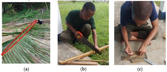 The process of obtaining sago midrib fiber material: (a) separation of the leaf from the midrib; (b) cutting the sago midrib; (c) separation of pith from the fiber; and (d) sago midrib fiber.
