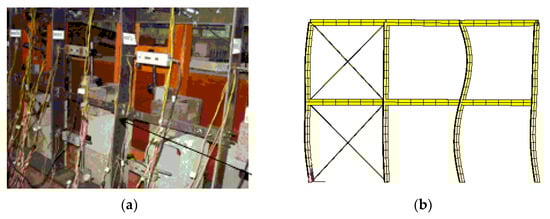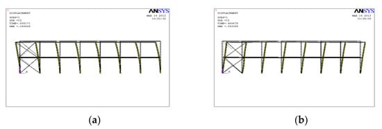 In the ANSYS program [16], the Beam 188 element was used to simulate columns and horizontal braces, while the Link10 element was utilized to simulate the diagonal braces. The hinged joints were simulated at the nodes of horizontal braces and columns by coupling translational displacements. There were twelve elements for each column member, six elements for each horizontal brace member and only one element for each diagonal brace member. According to Equations (5)–(8), the coordinates including the initial imperfections’ magnitudes and the directions were built up for these elements [22,23,24,25,26].