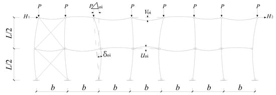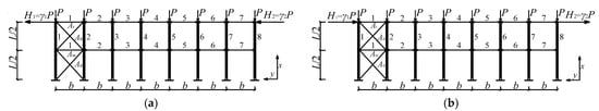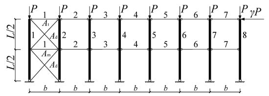 The role of braces has been well understood in practical engineering [1]. Bracing members in structural systems were divided into two categories according to the roles of braces: one resisting horizontal loads, including wind loads, earthquake loads, and crane loads, and the other providing intermediate lateral support to the member’s weak axis for enhancing its stability [2]. To reduce effective column lengths and resist longitudinal horizontal loads under vertical loads, the longitudinal bracing systems of column-braced systems of industrial plants are commonly composed of horizontal braces and diagonal braces. In practical engineering, the structure will bear vertical and horizontal loads, in which the horizontal load includes wind loads, earthquake loads, and crane loads besides providing support for structural stability. The design intermediate-height horizontal brace forces in column-braced systems under vertical loads have generally been investigated [3,4,5,6], but no important definitive research has been conducted on the design intermediate-height horizontal brace forces in column-braced systems under horizontal and vertical loads.