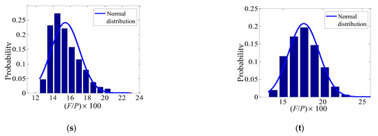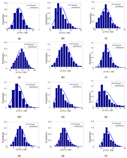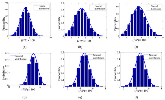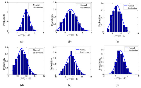 The results of six groups of F/P ratios obtained from different horizontal load combinations are presented in Figure 6. The relative frequencies were taken as the ordinates for various values of (F/P) × 100 (the abscissa). The probability of each abscissa value obtained from the FE analysis is represented by the area of single blue rectangle, and the sum of all the rectangular areas is 1. The theoretical probability density equations for the normal distributions represented by the solid lines were selected to fit the data.