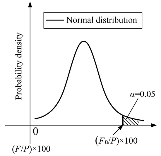 As mentioned previously, the distribution equations F(x) can predict the F/P ratio to a certain significance level, α. In this paper, α = 0.05 was selected as the significance level and then the characteristic values Fn/P were selected as the force of an intermediate-height horizontal brace with a 95% guarantee rate, as displayed in Figure 7.