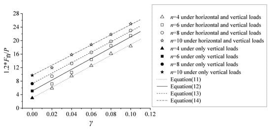 Both Table 6 and Figure 10 show a comparison of 1.2 × Fn/P between horizontal and vertical loads (γ = 0.02 − 0.1) and only vertical loads (γ = 0) [6]. It can be seen that 1.2 × Fn/P under horizontal and vertical loads is much larger than 1.2 × Fn/P under only vertical loads when n is certain, and that 1.2 × Fn/P under vertical and horizontal loads increases with an increase in the horizontal load coefficient γ from 0.02 to 0.1. The reasons are the following: the horizontal loads decrease P and the lateral stiffness of the columns, which can result in an increase in F for σ, ensuring the longitudinal stability of columns.