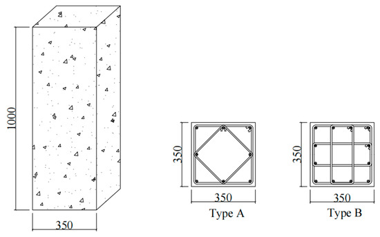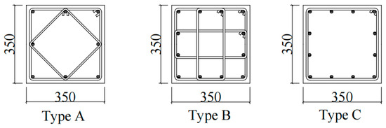 The finite element analysis model verified by the test was used to further analyze the mechanical performance of concrete stub columns confined by CRB600H high-strength stirrups under axial compression. The material property parameters of the CRB600H reinforcement were detailed in the literature [27]. In the paper, 7 groups of 39 reinforced concrete stub columns with dimensions of 350 mm × 350 mm × 1000 mm were designed. The design parameters were concrete strength, stirrup strength, stirrup form and stirrup spacing. The concrete strength is 26.8~44.5 MPa; the diameter of the stirrups was 8 mm, and the types of stirrups were the HRB400 reinforcement and CRB600H reinforcement. The CRB600H reinforcement was used to replace the HRB400 steel bar with equal volume and equal strength; the stirrup volume ratio was 1.116%~4.466%; the stirrups were divided into three types, A, B and C, as shown in Figure 5. The detailed design parameters of the specimens are shown in Table 3.