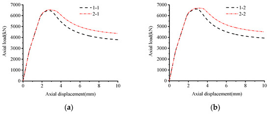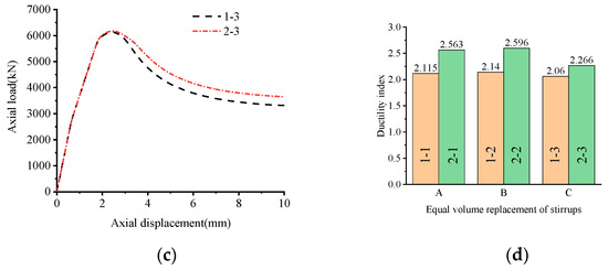 The influence of the volume substitution of the stirrups on the load-displacement curve of the specimens is shown in Figure 6a–c It can be seen from the diagram that there is little difference in the peak bearing capacity of concrete columns with CRB600H stirrups compared with those with HRB400 stirrups; this is due to the fact that the configured CRB600H stirrups fail to reach the yield strength when the specimen reaches the peak load. High-strength stirrups still have a certain amount of surplus, and cannot give full play to the restraining effect of high-strength stirrups, which can be used as a safety reserve to ensure good ductility of the confined concrete specimens before reaching the ultimate failure state. The effect of replacing the HRB400 reinforcement with the CRB600H reinforcement of equal volume on the ductility index of the specimen is shown in Figure 6d. The ductility of specimen 2-1 is 21.2% higher than that of specimen 1-1, the ductility of specimen 2-2 is 21.3% higher than that of specimen 1-2, and the ductility of specimen 2-3 is 10% higher than that of specimen 1-3. This shows that the configuration of CRB600H stirrups improves the constraint on the concrete in the core area compared with HRB400 stirrups, and improves the ductility of the specimen in the later period.