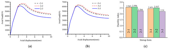 In order to study the influence of stirrup forms on the axial compression performance of the specimens, three stirrup constructions, including type A, type B and type C, were set as shown in Figure 5. The load-displacement curve of concrete restrained by stirrups is shown in Figure 8a,b. The peak load of specimen 2-2 is 2.1% and 7.8% higher than the peak load of specimen 2-1 and 2-3, and the peak load of specimen 3-2 is 1.5% and 6.1% higher than the peak load of specimens 3-2 and 3-3, indicating that stirrup type B with the same stirrup ratio has the best restraining effect on concrete, while stirrup type A takes second place, and stirrup type C has the worst restraining effect. The influence of the CRB600H reinforcement on the ductility index of the specimens under different stirrup forms is shown in Figure 8c, where the ductility index of specimen 2-2 is 1.3% and 14.6% higher than that of specimens 2-1 and 2-3, respectively. The ductility index of 3-2 is 2.7% and 13.9% higher than that of specimens 3-1 and 3-3, respectively.
