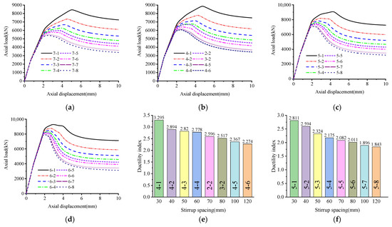 Effect of stirrup spacing: (a) fc = 26.8 MPa; (b) fc = 30.7 MPa; (c) fc = 38.5 MPa; (d) fc = 44.5 MPa; (e) ductility index (fc = 30.7 MPa); (f) ductility index (fc = 38.5 MPa).