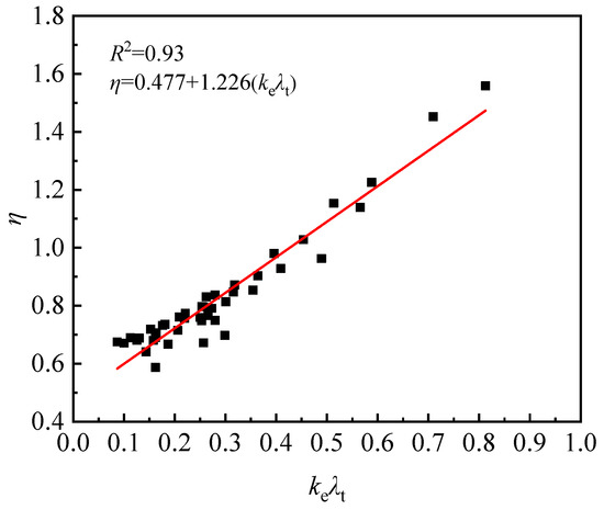 The lifting coefficient η of the bearing capacity is linearly fitted with the effective confinement index (keλt), and the results show that they have a linear distribution, as shown in Figure 11: