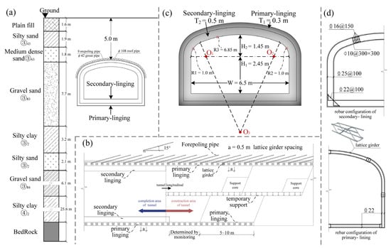 Tunnel configuration (a) distribution of soil layers (b) the direction of the longitudinal axis of the tunnel (c) the shape of tunnel section (d) reinforcement configuration of tunnel.