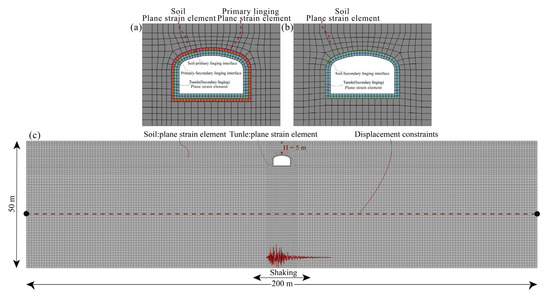 The dynamic response of the primary and secondary concrete lining of the tunnel under earthquake is simulated using an elastic model and a damage plastic model built into ABAQUS, which is defined by damage and compression factors. The parameters of the damage plasticity model are discussed in Section 2.3. The rebar is simulated using a linear elastic material, including elastic modulus and density. The response of soil under earthquake is simulated by an elastic-plastic model, which includes an elastic and elasto-plastic analysis. First, in the elastic analyses, the soil is considered as a visco-elastic model, and the dynamic properties of the soil at small strain states are evaluated by 1D equivalent linear analysis, which mainly refers to the equivalent shear modulus and equivalent viscous damping of the soil. Secondly, in the 2D full dynamic time analysis of the STM tunnel, the elasto-plastic model is used for the nonlinear plastic deformation analyses of soils under seismic action, which mainly combines the equivalent linear properties of soils and the Mohr–Coulomb yield criterion to characterize the permanent deformation and hysteretic energy dissipation of soils under large strain states. The aforementioned nonlinear models of soils have been proven to be effective by many researchers [1,39,40], as their parameters are easily calibrated and controlled. The material mode of the soil and the tunnel are summarized in Table 3, where three different numerical cases for the dynamic response of tunnel are examined.