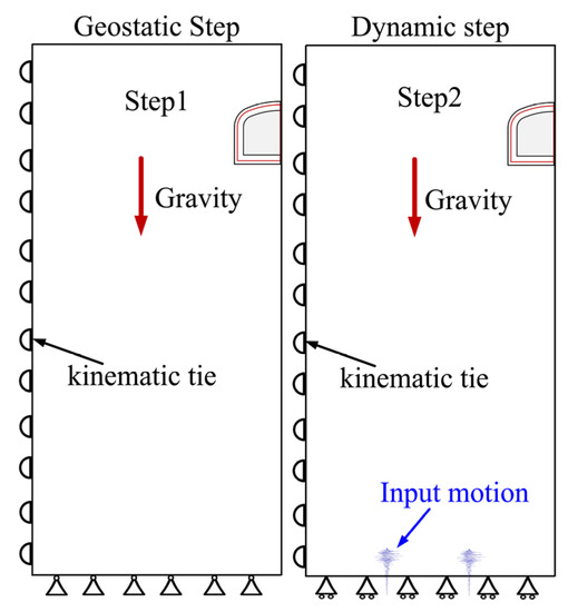 The full dynamic time analysis is performed in two steps, which are illustrated in Figure 3. First, gravity loads are applied in a static analysis step to obtain the STM tunnel system’s initial geostatic stress state, in which the effect of tunnel construction on the initial geostatic stress state is ignored. Subsequently, seismic motions are applied to the bottom boundary of the model in a dynamic analysis step in the form of acceleration time histories. The bottom boundary of the finite element model is modeled as rigid bedrock. During the geostatic analysis step, the vertical and horizontal directions of the bottom boundary are constrained. In the dynamic analysis step, the horizontal direction of the bottom boundary is released. Kinematic tie constraints are applied to the lateral boundaries of the model to ensure that the nodes of the opposing lateral boundaries at the same depth location have the same displacement pattern during the earthquake, thus simulating the response pattern of the shear beam.