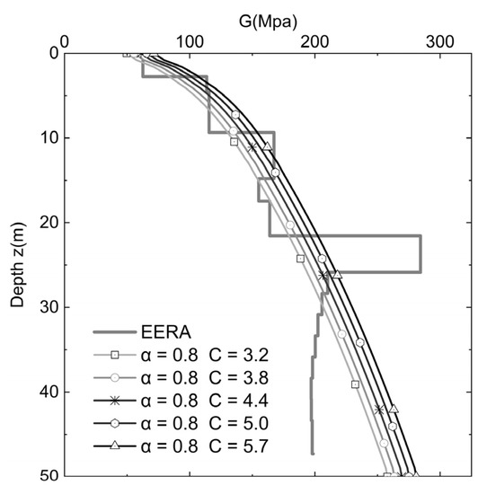 The dynamic properties of the small-strain shear modulus of soils are proposed by Hardin and Drenvich [41], which can better match the results of resonant columns and triaxial cyclic tests. Many scholars have verified the effectiveness of the small-strain shear modulus model. The soil’s small-strain equivalent shear modulus and damping properties can be obtained by a one-dimensional (1D) equivalent linear response analysis implemented in the frequency domain. The whole site response is computed in the EERA software. The initial shear modulus of the soil is estimated through equation G = ρVs2 before EERA iterative analysis. A typical G-γ-D curve is used throughout the analysis. The calculated results compared with the small-strain shear modulus formula proposed by Hardin and Drnevich show that the empirical formulations are high for the estimated shear modulus. After a series of numerical computer comparisons, the following Equation (2) is used in this paper to describe the variation of the soil shear modulus during the earthquake. The introduction of the constant C to correct the shear modulus computed by empirical formulations has been proven effective [42].