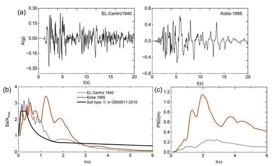 Two actual acceleration records (Table 8) are selected as seismic input motion for the 2D coupled STM tunnel system dynamic analysis. The selection of EL-Centro was made on the basis of spectral matching with the GB50011-2010 spectrum for soil type II. Since the seismic response of the tunnel mainly depends on the deformation of the surrounding ground, the Takatori record, which can generate a notable displacement response of soil, as shown in Figure 6c, was selected to evaluate the response of the STM tunnel. The seismic motion is input from the bottom of the numerical model. The EL-Centro record from the 1940 Imperial Valley earthquake is characterized by a duration of 30 s and a maximum acceleration of 0.35 g. The Takatori record from the 1995 Kobe earthquake is characterized by a duration of 41 s and a maximum acceleration of 0.65 g. The PGA of input records is scaled from 0.1 to 0.3 g to investigate the dynamic response of the SPS systems to increasing seismic intensity levels. The duration of input records is intercepted for the 20 s. Figure 6 portrays the acceleration time histories of the input motions.