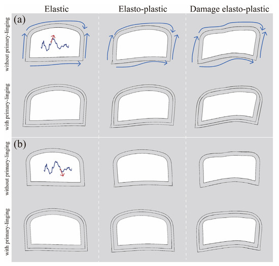 - The existence of the primary lining slightly reduces the deformation increment of the tunnel diagonal while having no evident influence on the rotation of the tunnel. The decrease of the tunnel diagonal increment caused by the primary lining is within 10% for the elastic and elasto-plastic analysis. The presence of the primary lining changes the tunnel’s deformation mode when considering the plastic behavior of the lining.