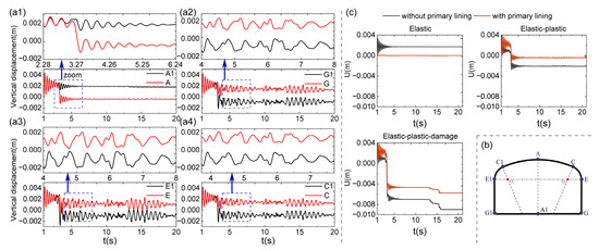Vertical displacement of the tunnel with primary lining (a1–a4) time histories (b) monitoring stations (c) time histories of the vertical displacement of the tunnel crown.