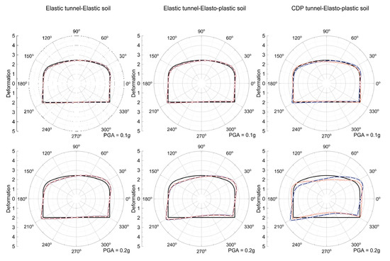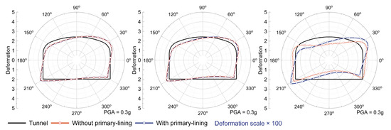 Figure 9 illustrates the effect of the primary lining on the deformation of the tunnel. These results refer to the elastic, elasto-plastic, and damage elasto-plastic analysis of the STM tunnel. The input motion is EQ1 with PGA scaled to 0.1 g, 0.2 g, and 0.3 g. For both elastic and elasto-plastic analysis, the existence of primary lining has a slight reduction effect on the deformation of the tunnel. When considering the damage and plastic deformation of the tunnel, the existence of primary lining leads to significantly different tunnel deformation modes. Additionally, this effect will become more pronounced as the PGA value increases.