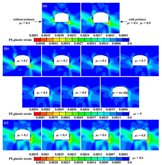 Soil plastic strain distributions (a) tunnels without and with primary lining (b) tunnels with primary lining; μ1 = 0.2, 0.4, 0.6, 0.8 and no-slip; μ2 = 0 (c) tunnels with primary lining; μ1 = 0.6; μ2 = 0.2, 0.4, 0.6, 0.8.