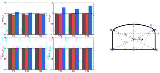 Figure 11 portrays the representative response ratio referring to the reference line of the tunnel at the time step of the maximum deformation of the tunnel. The figure shows that for most of the examined cases, the deformation of tunnel is constrained by the primary lining, while magnified in a few cases. In particular, in terms of ΔDFC, the difference is within 5% for elastic analysis, 10% for elasto-plastic analysis, and 6% for damage elasto-plastic analysis. In terms of ΔDHE, the difference is within 5% for elastic and elasto-plastic analysis, while the differences may reach 35% for damage elasto-plastic analysis. The deviations change insignificantly with the increase of ground motion. Compared with the deformation of the reference axis, the primary lining has almost no obvious effect on the rotation angle increment of the reference axis (θCox and θAox). The increase or decrease of the rotation angle of each reference axis is within 1%. The potential weak tangential behavior of the contact surface between the primary and secondary lining may cause unobvious rotation angle deviation.