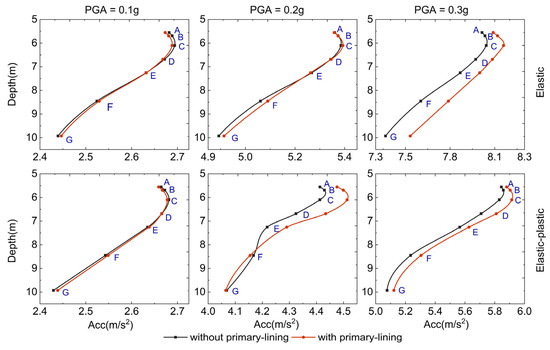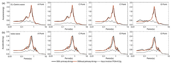 The representative values of the acceleration response spectrum at different positions of the tunnel are depicted in Figure 13. The analysis results mainly come from the elasto-plastic analysis of the soil. The calculation results refer to EQ1 and EQ2, which input motion PGA = 0.2 g. For EQ1, when the frequency is higher than 1.47 HZ, the presence of the primary lining can slightly reduce the acceleration response of the tunnel. When the frequency is lower than 1.47 HZ, the primary lining can amplify the horizontal acceleration of the tunnel. For EQ2, there are similar conclusions, and the difference is that the frequency is 1.61 HZ. Generally speaking, the influence of the primary lining on the acceleration response of the tunnel becomes insignificant as the input PGA increases.