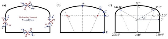 Generally, in most cases, the consideration of the existence of primary lining constrains the deformation of the tunnel. For a preliminary quantitative analysis of this effect, the response ratios of the oblique reference line CF, the line HE, and the angle θ between the oblique reference line and the horizontal line are calculated by Equations (4) and (5). The detailed configuration can be found in Figure 11.